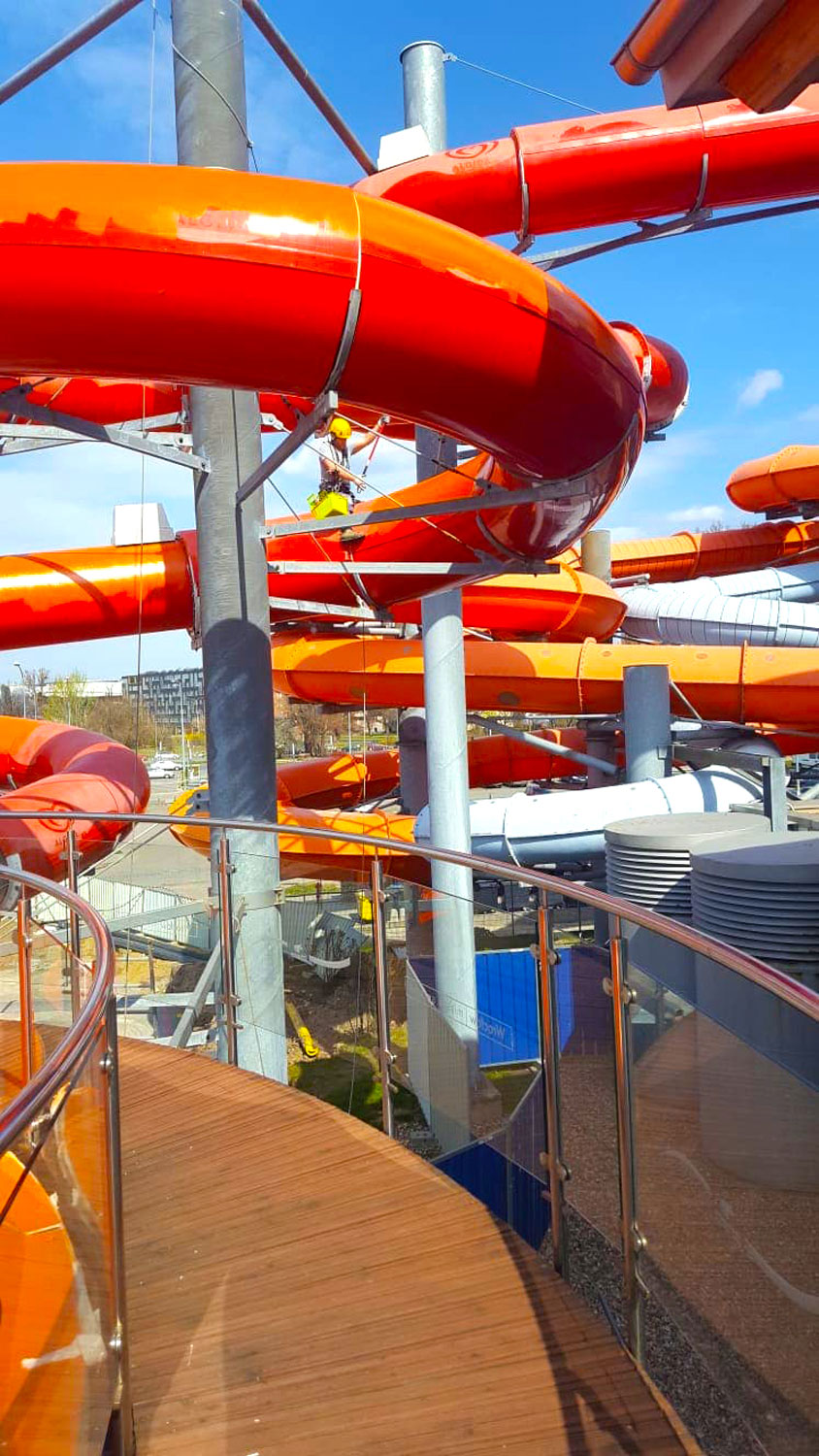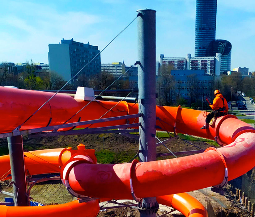 Pod koniec 2019 roku nasi pracownicy wysokościowi zaczęli przygotowania do prac renowacyjnych zjeżdżalni wodnej we Wrocławiu. Prace polegały wstępnie na usunięciu starych i bardzo mocno zgrzanych z powierzchnią naklejek reklamujących sponsora. Choć z wielkim trudem, to jednak naklejki usunęliśmy.